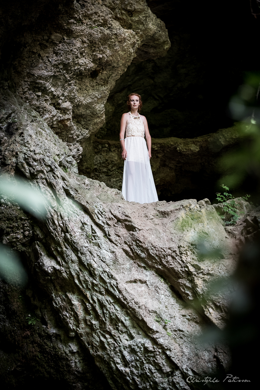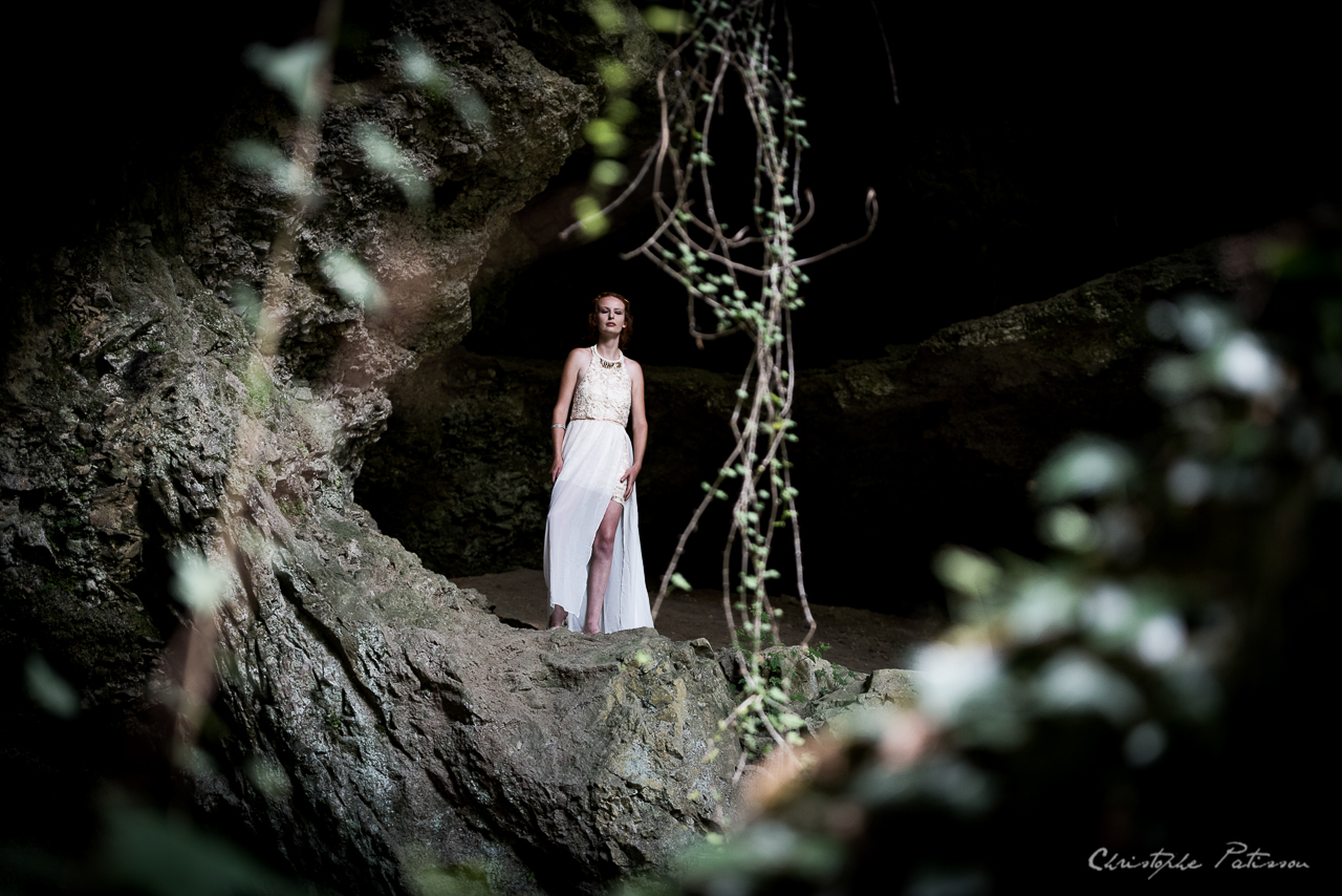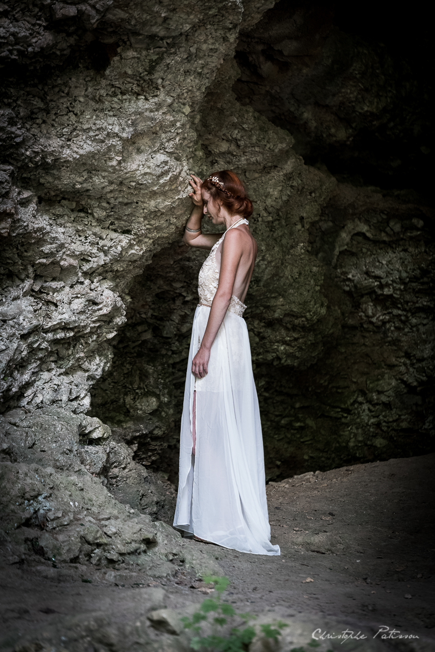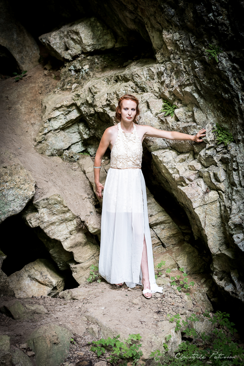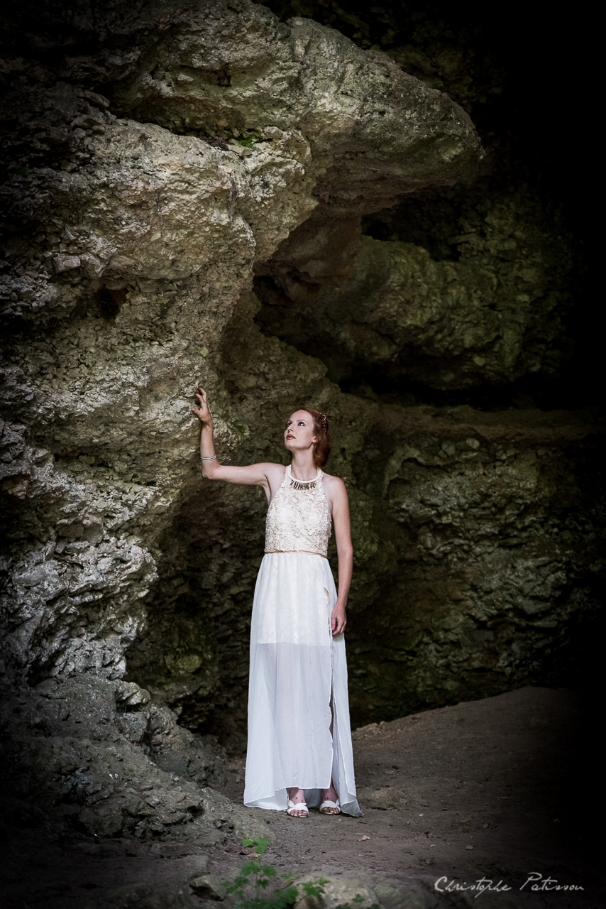 Et Sandrine s’est prêtée au jeu du portrait en nature avec une nouvelle robe obtenue initialement dans le cadre d’un autre projet qui n’a pas vu le jour, hélas ! Qu’à cela ne tienne, les mensurations de Sandrine ont permis d’utiliser la robe et de réaliser une très belle séance photo avec. Dans un style chic et épurée, cette robe allait parfaitement bien avec le décors sauvage, brut et primaire : une grotte comme on les aime !