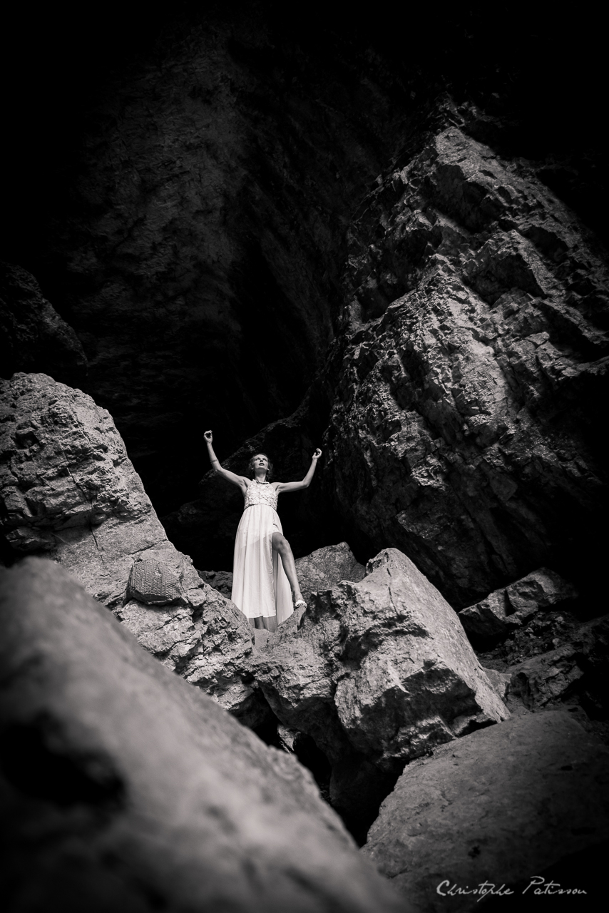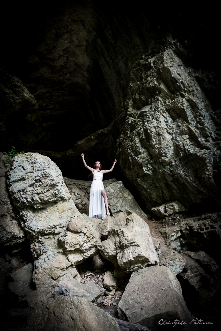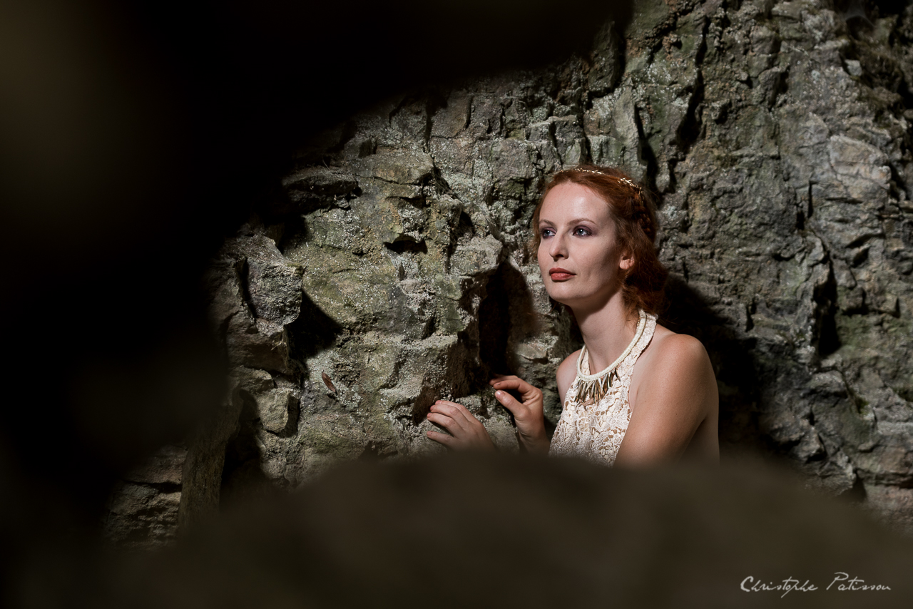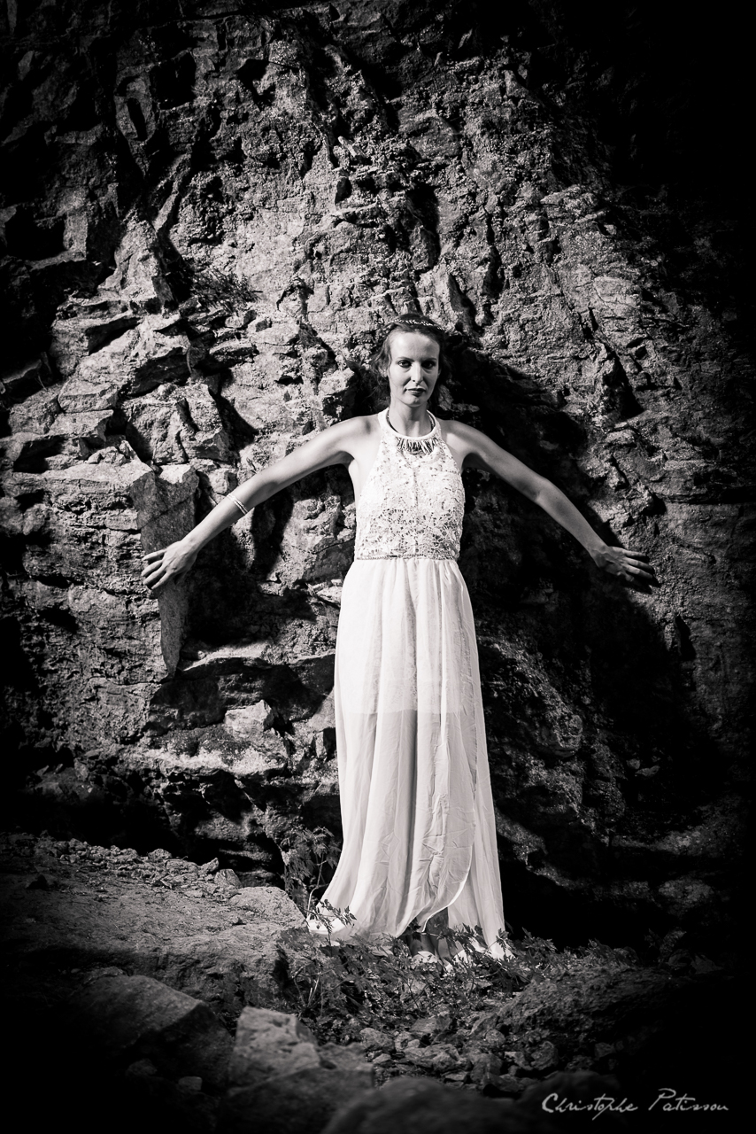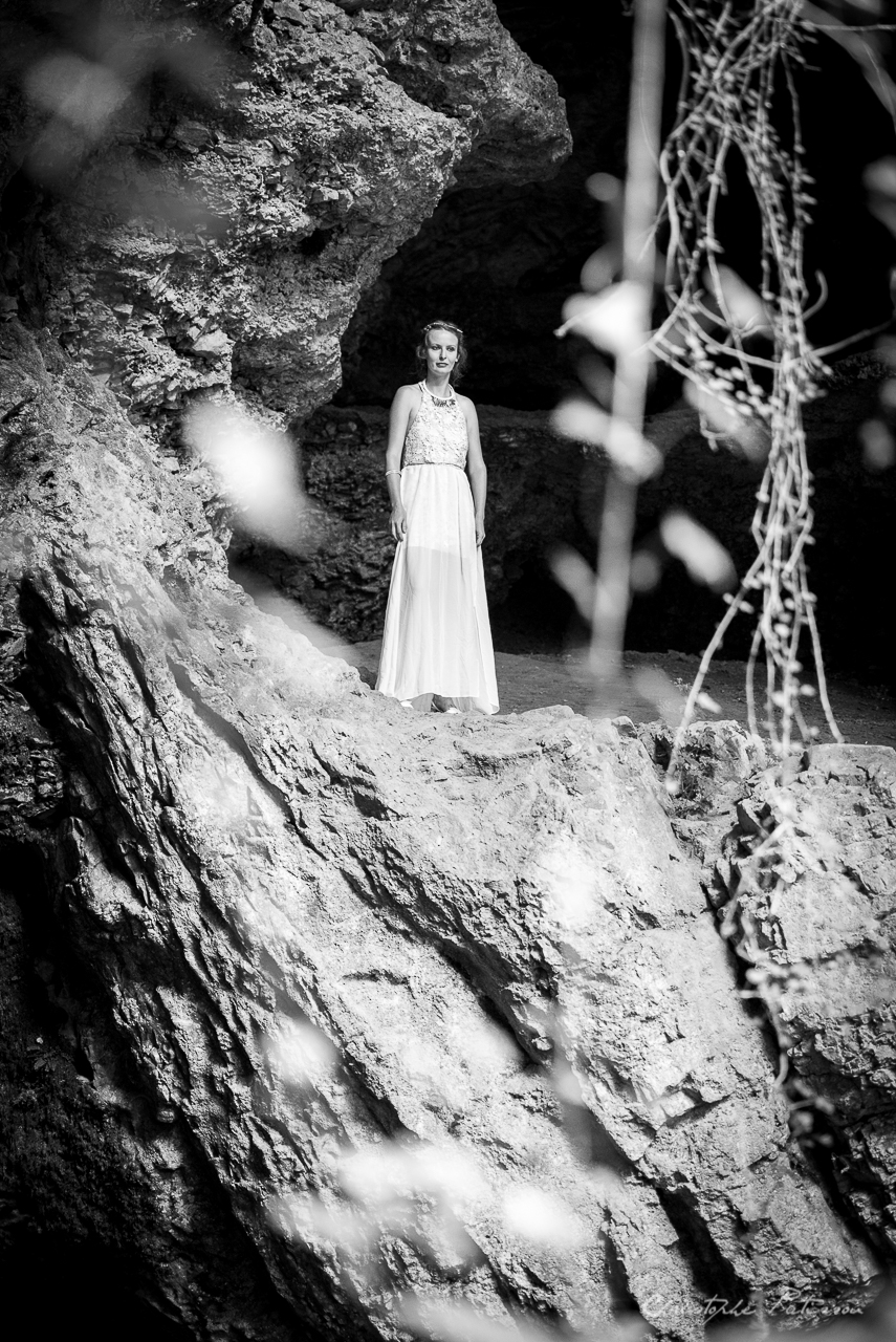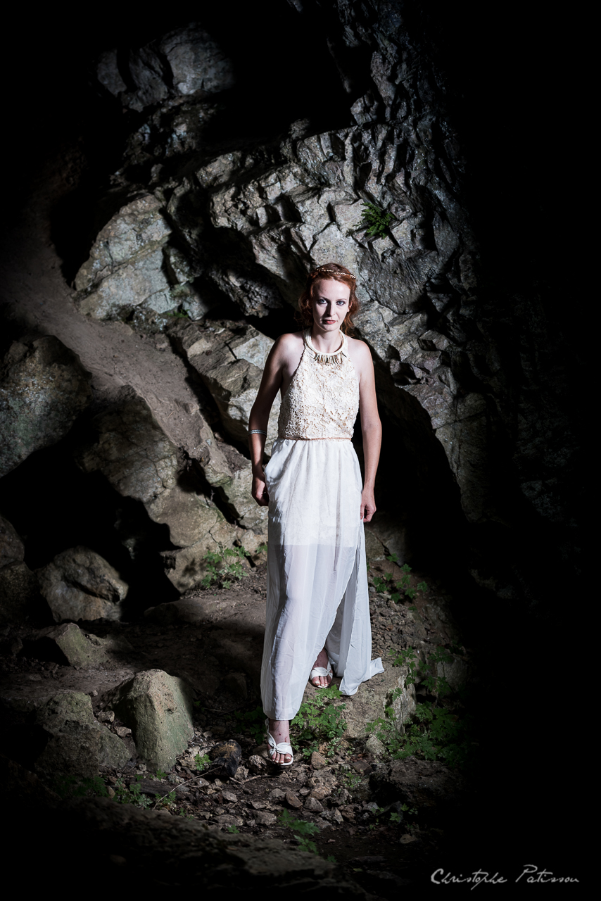 Et Sandrine s’est prêtée au jeu du portrait en nature avec une nouvelle robe obtenue initialement dans le cadre d’un autre projet qui n’a pas vu le jour, hélas ! Qu’à cela ne tienne, les mensurations de Sandrine ont permis d’utiliser la robe et de réaliser une très belle séance photo avec. Dans un style chic et épurée, cette robe allait parfaitement bien avec le décors sauvage, brut et primaire : une grotte comme on les aime !