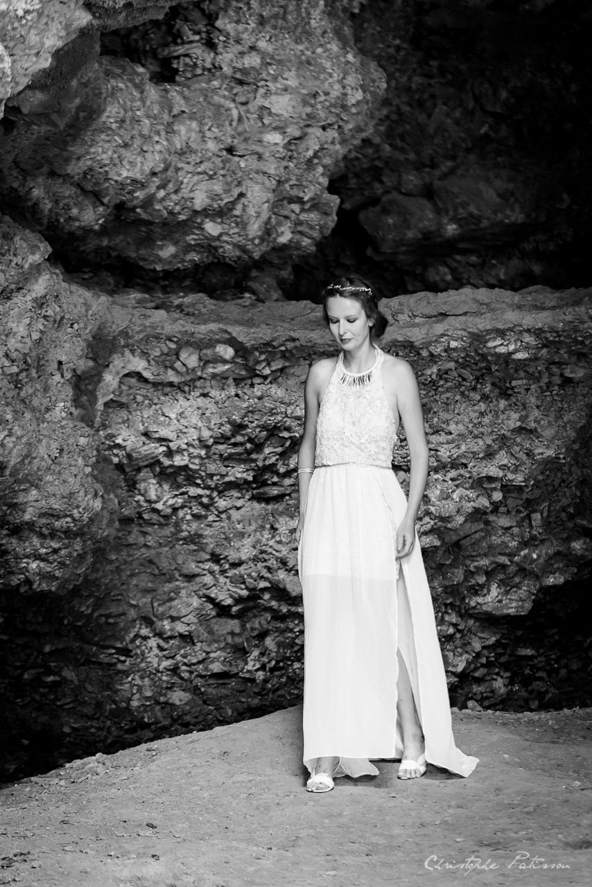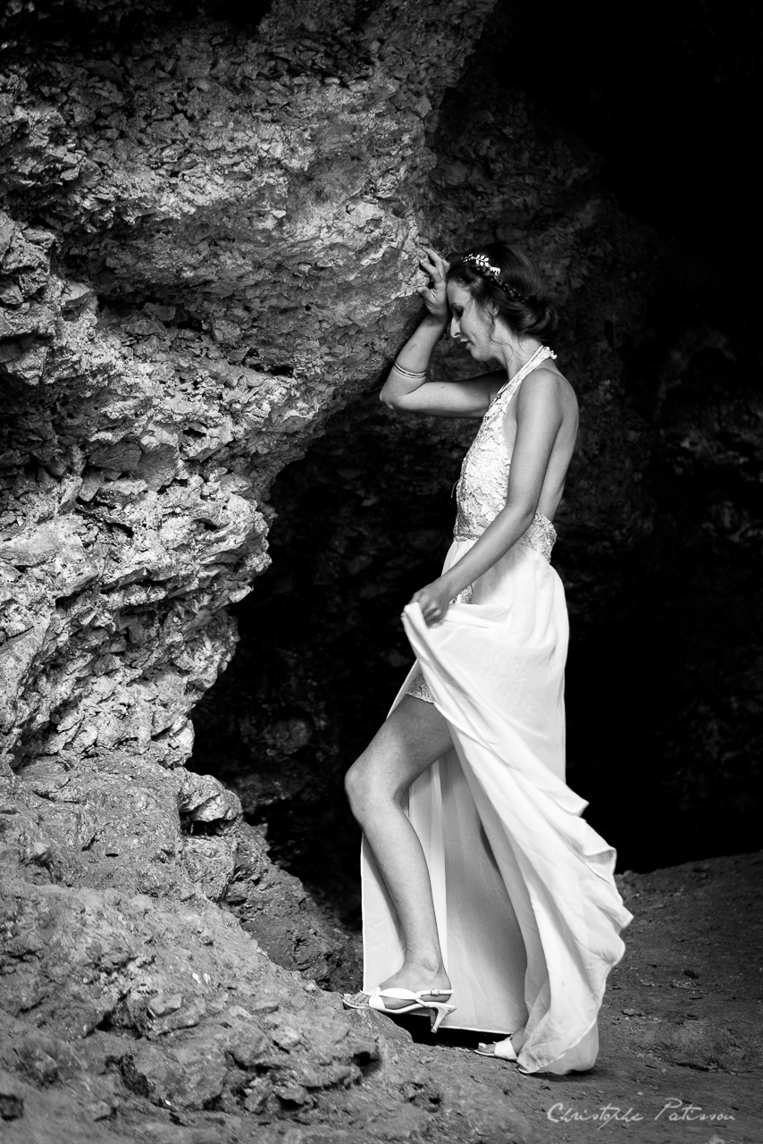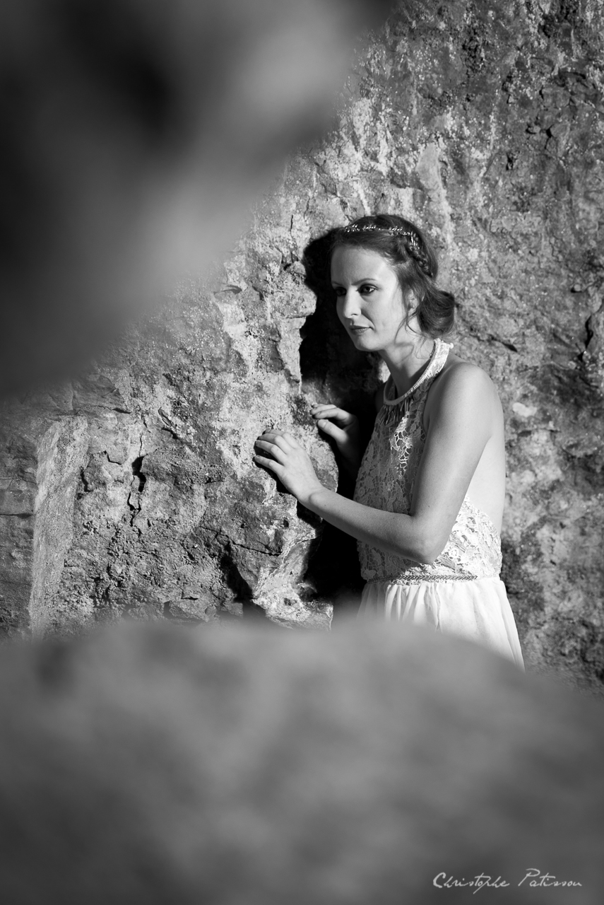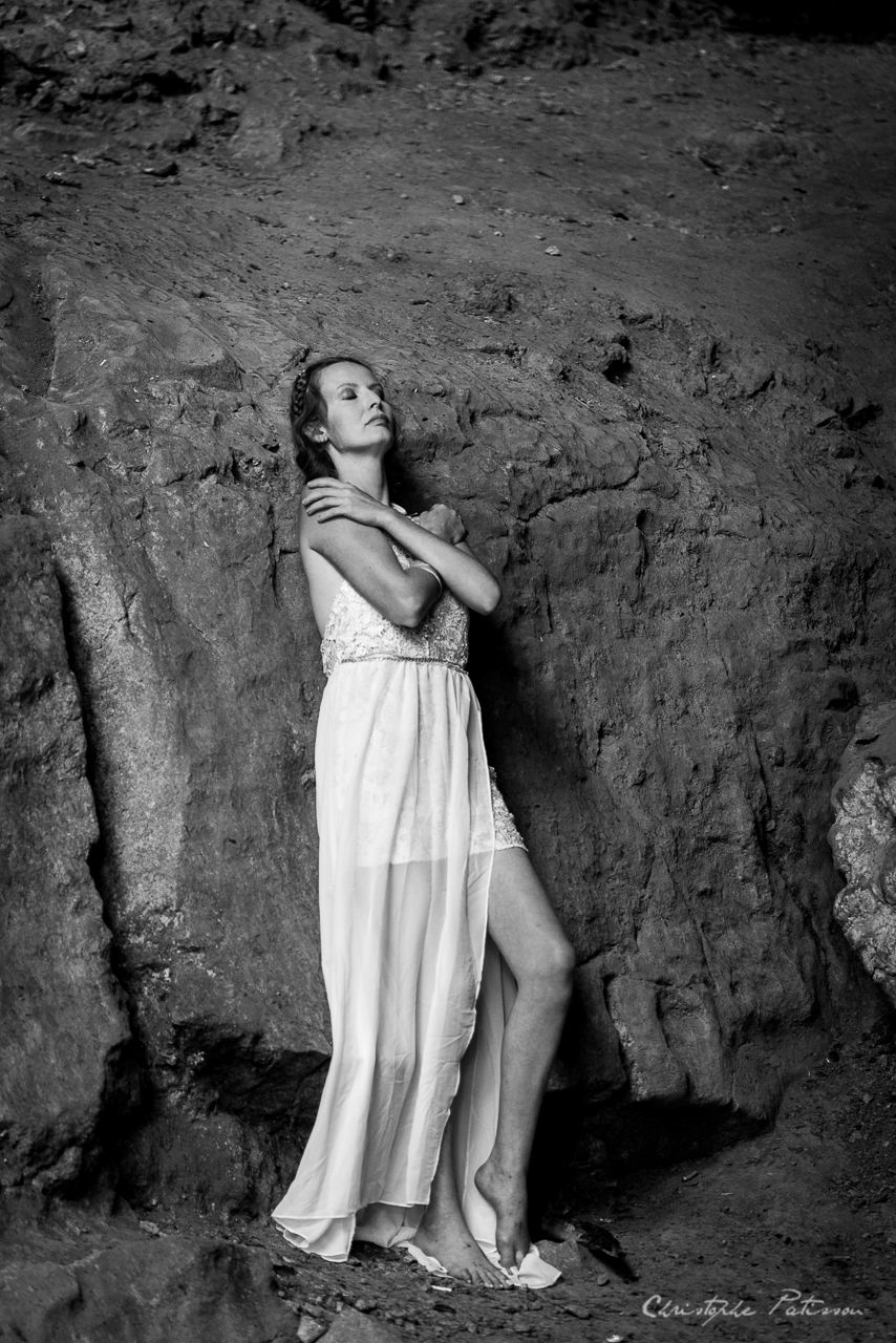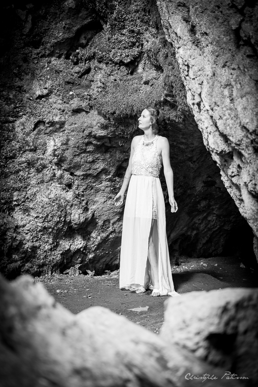 Et Sandrine s’est prêtée au jeu du portrait en nature avec une nouvelle robe obtenue initialement dans le cadre d’un autre projet qui n’a pas vu le jour, hélas ! Qu’à cela ne tienne, les mensurations de Sandrine ont permis d’utiliser la robe et de réaliser une très belle séance photo avec. Dans un style chic et épurée, cette robe allait parfaitement bien avec le décors sauvage, brut et primaire : une grotte comme on les aime !