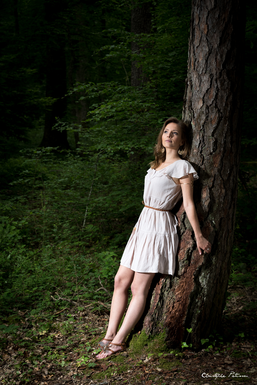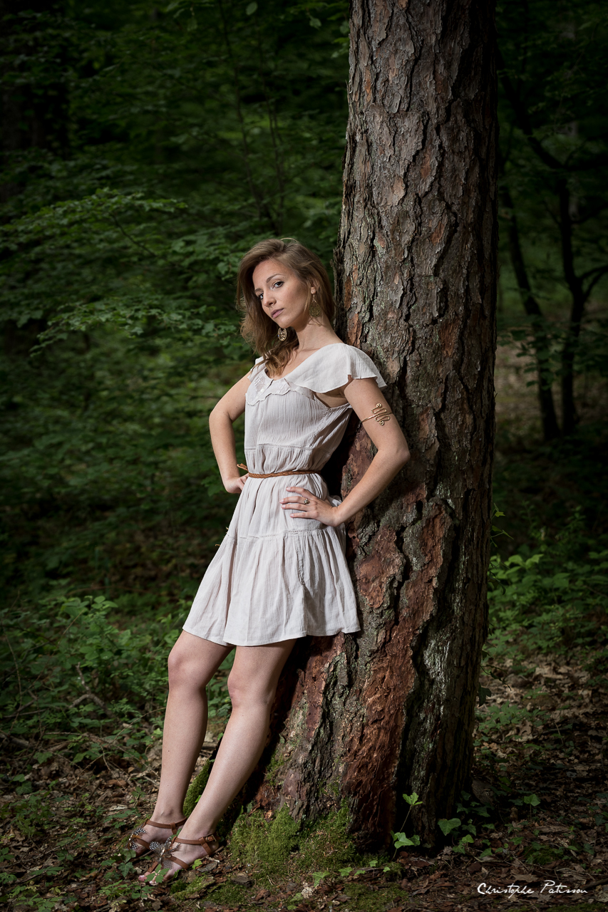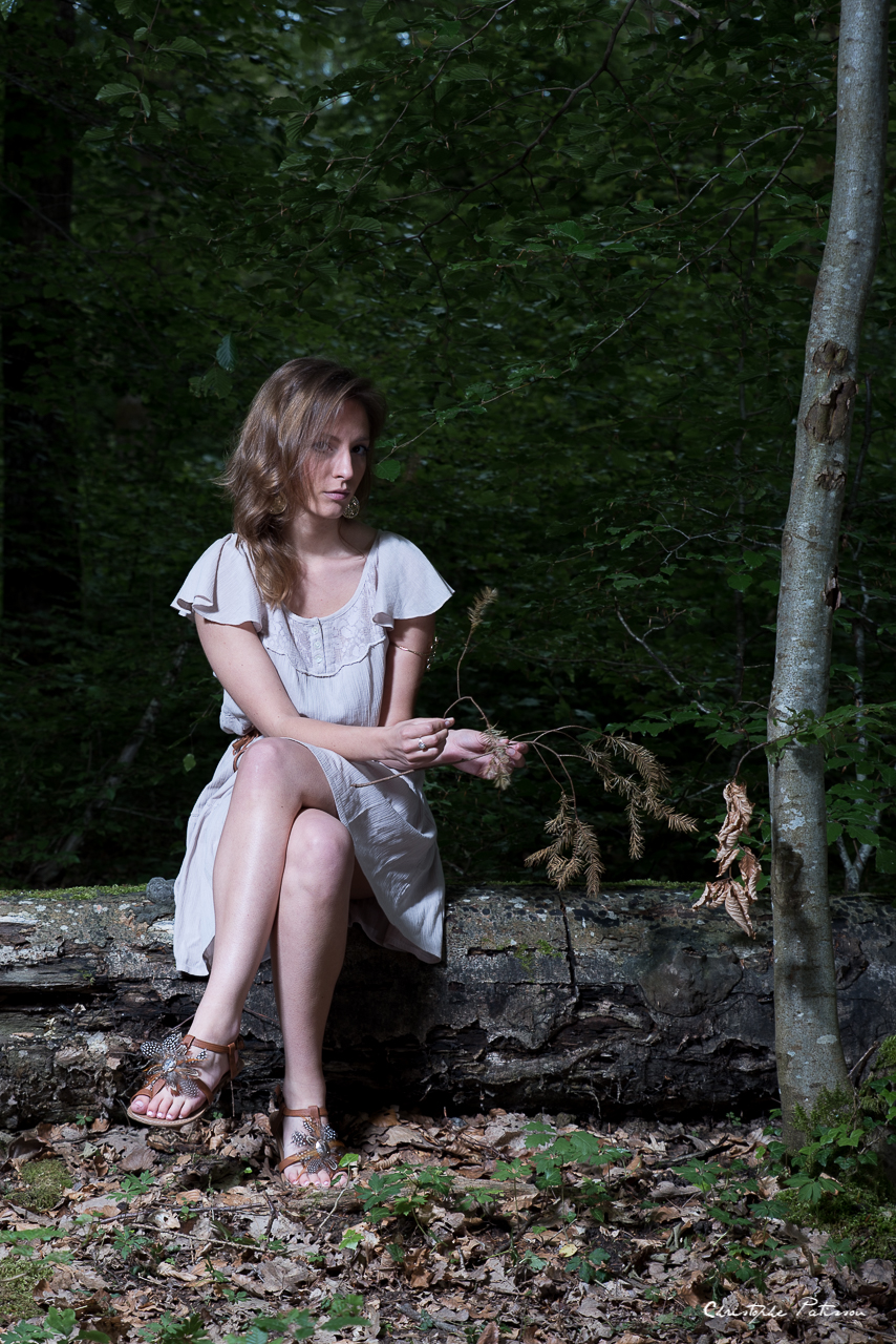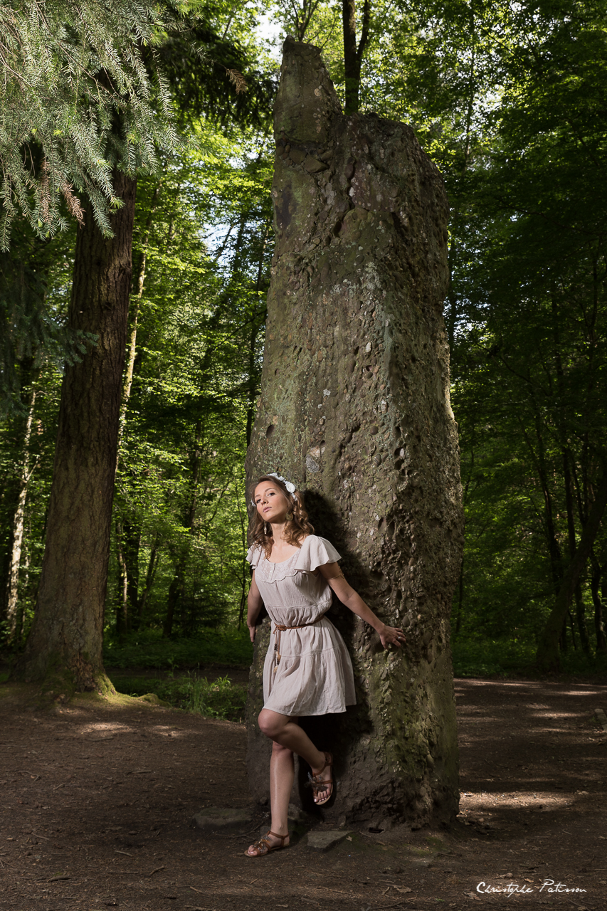 L’idée de la séance était de mettre en scène une femme et le menhir. Il y a deux façon d’interpréter la scène. On peut voir le menhir comme un symbole phallique ou à la façon d’un totem de sioux. Pour ma part, j’ai voulu utiliser la fonction première du menhir qui est de canaliser et distribuer l’énergie tellurique. La séance photo reste dans un style de photo de mode et comme les environs immédiats du menhir de Langenstein n’avaient rien d’exceptionnel, nous avons poursuivi notre séance dans la forêt, jouant sur le chemin, avec les arbres, avec la nature…