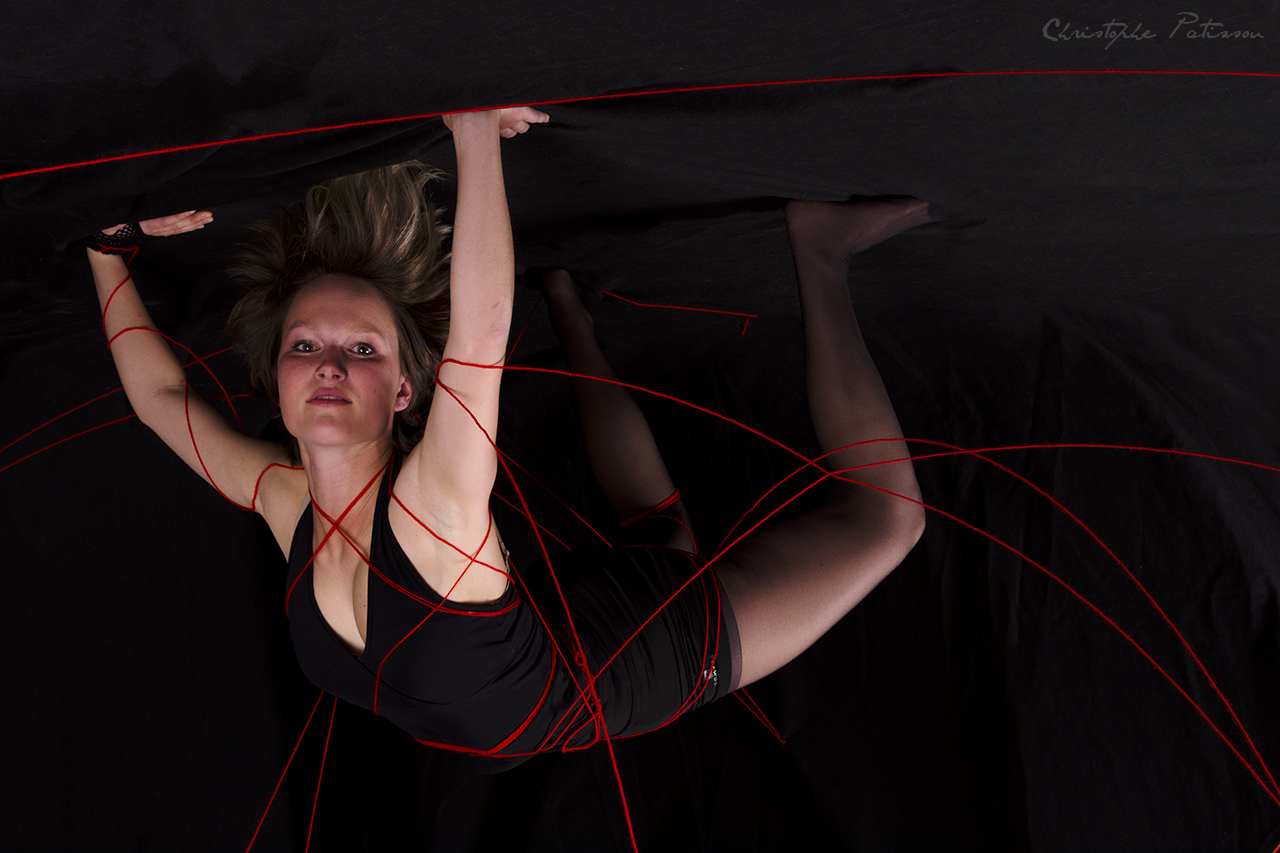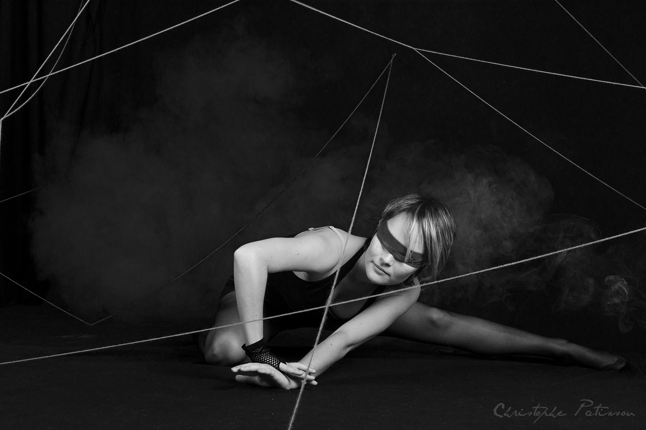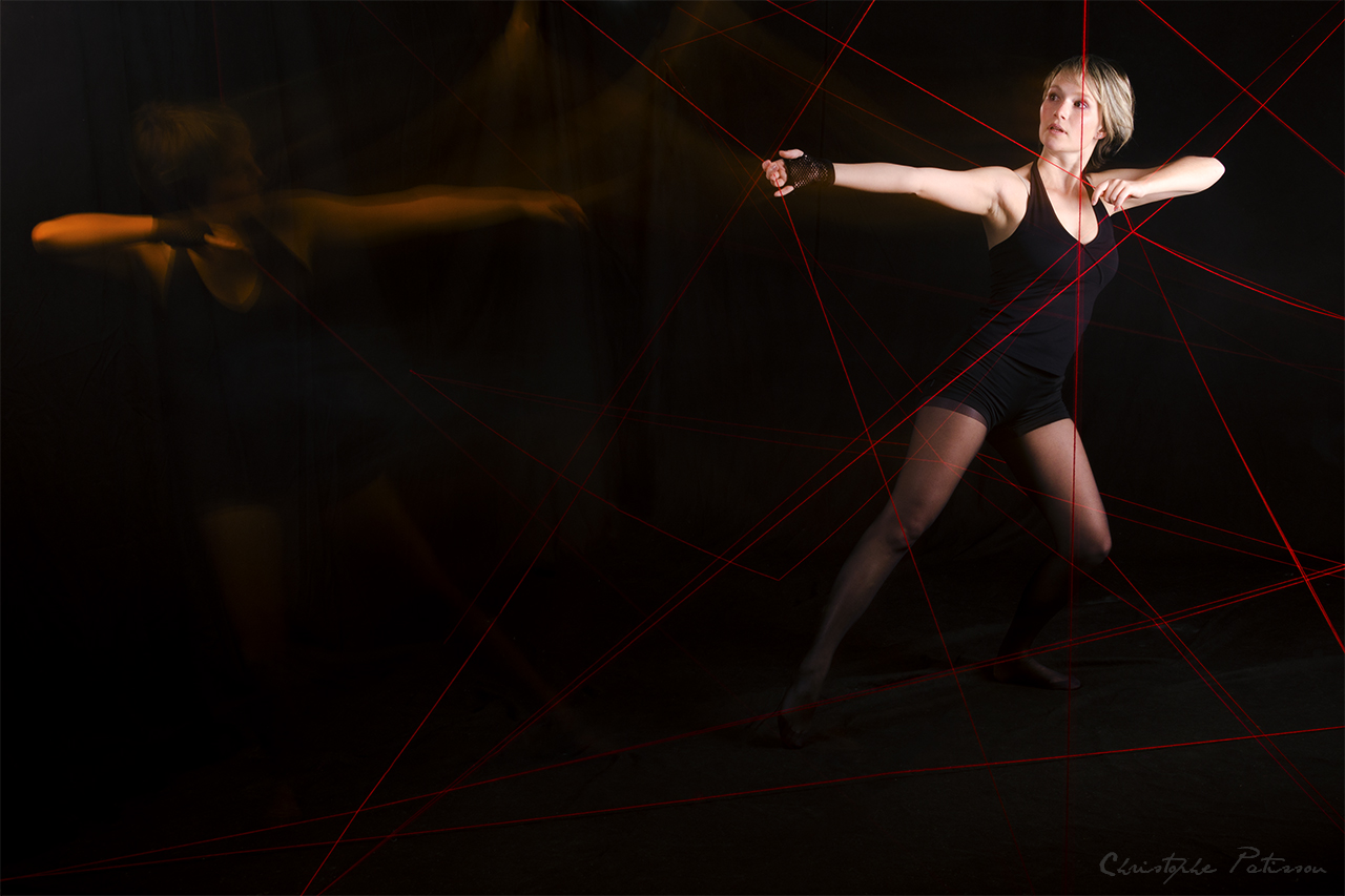 Le fond noir va nous aider. La pose durera entre 20 et 30 secondes. Pendant ce temps-là, Élodie va évoluer (en aveugle) sur la scène et je déclencherai à trois reprise les flashs. Comme nous travaillons dans le noir, il a fallu beaucoup d’essai et de tri avant d’obtenir quelques photos intéressantes !
