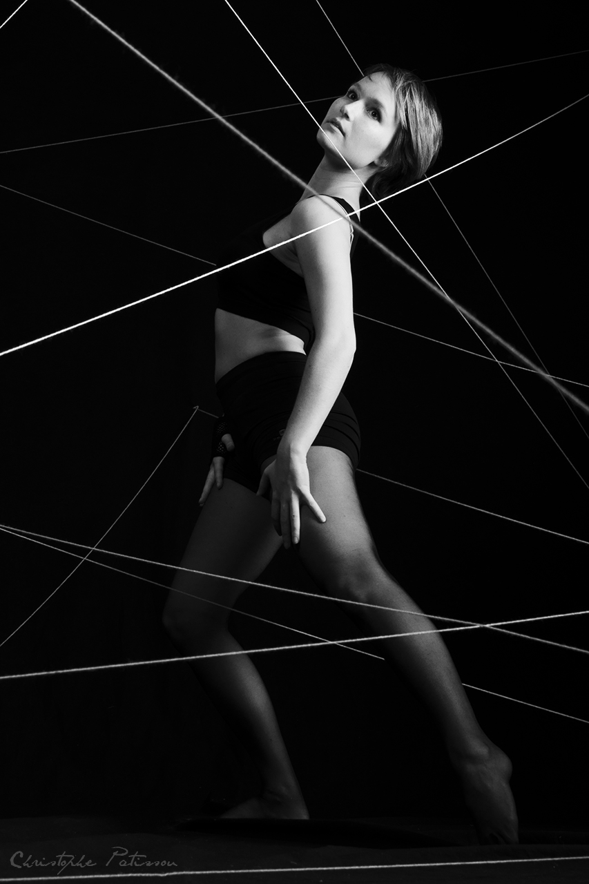 Le travail le plus fastidieux a été de positionner chaque fils de façon à créer une trame graphique. Celle-ci doit être réfléchie en trois dimensions de façon à pouvoir varier les prises de vue. Les fils devront être fixés de manière robuste pour s’éviter les reprises en cours de shooting.